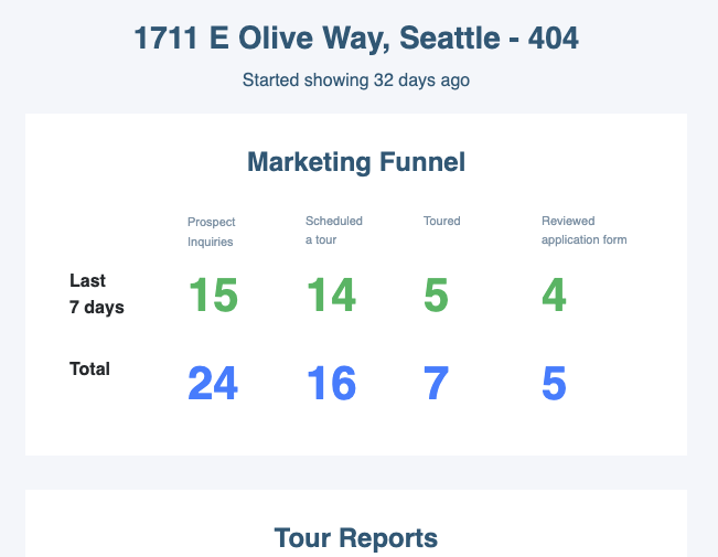 About: An email is sent once per week on Monday morning for each property, containing marketing funnel statistics and tour reports from completed tours over the past 7 days. Read more about this report HERE