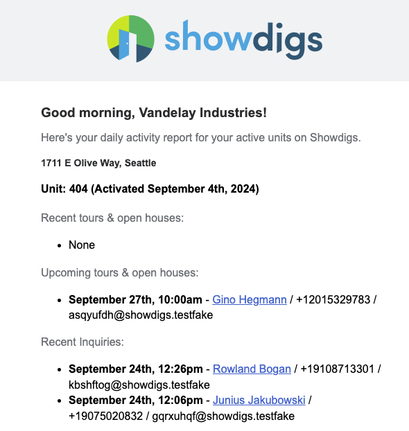 About: This notification provides a single, digest-style email each day that includes a list of recent tours, upcoming tours, and recent inquiries for your active units.