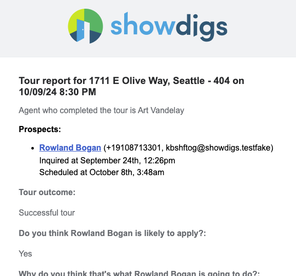 About: This notification sends an individual tour report when a tour is completed, including tour details, prospect contact information, and the full report. This also includes emails related to the tour budget being reached.