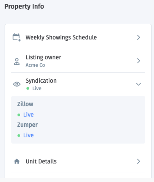If you have ILS syndication enabled with any network, you can view the statuses for your ads on the property page by navigating to Properties > [Select Property] > Overview > Property Info. In the Property Info section, you will find an overview of the syndication statuses. Expand this section to see the status for each network.