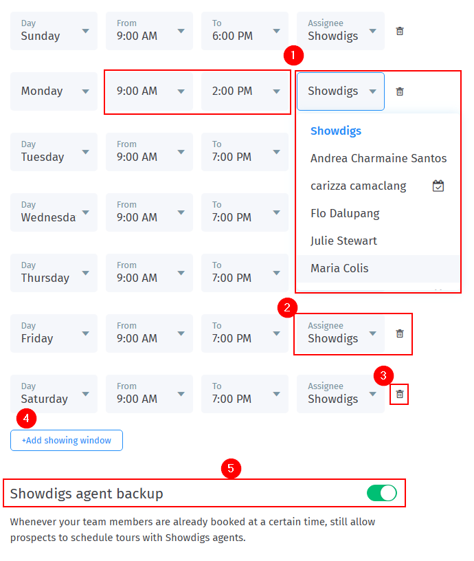 Add a showing window, to split a day between different team members, or between showings and your team. For example, you'd like to assign all morning tours to showings, and afternoon-evening to one of your team members.