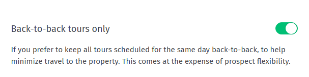This option is available if you would like to only allow leads to schedule back-to-back tours so that you (or your team member who is assigned to the showing window) will not need to drive back and forth to the same location during any given showing window.
