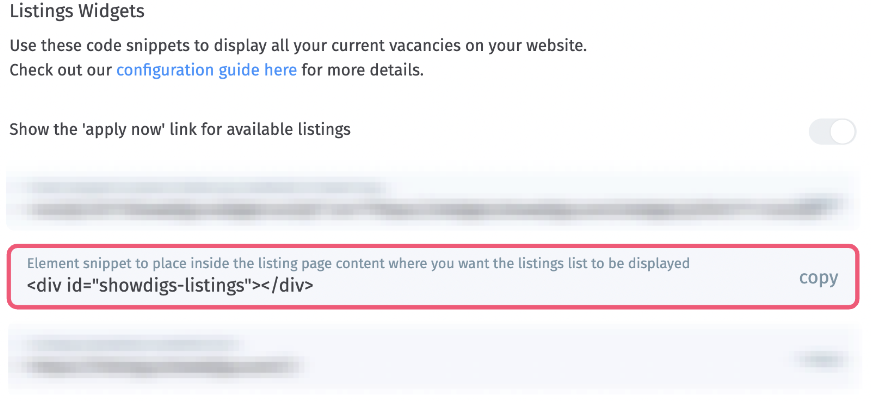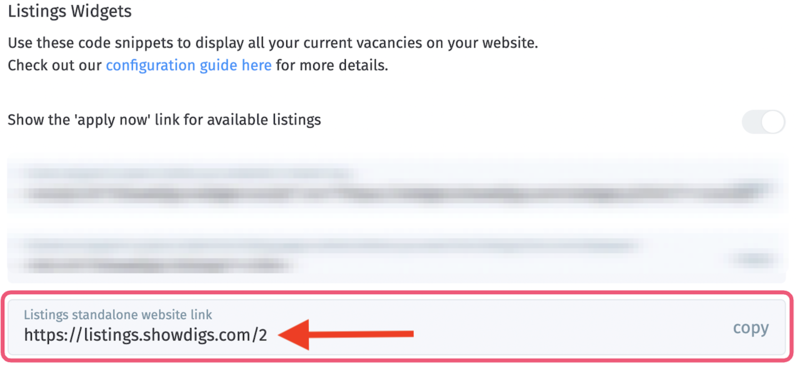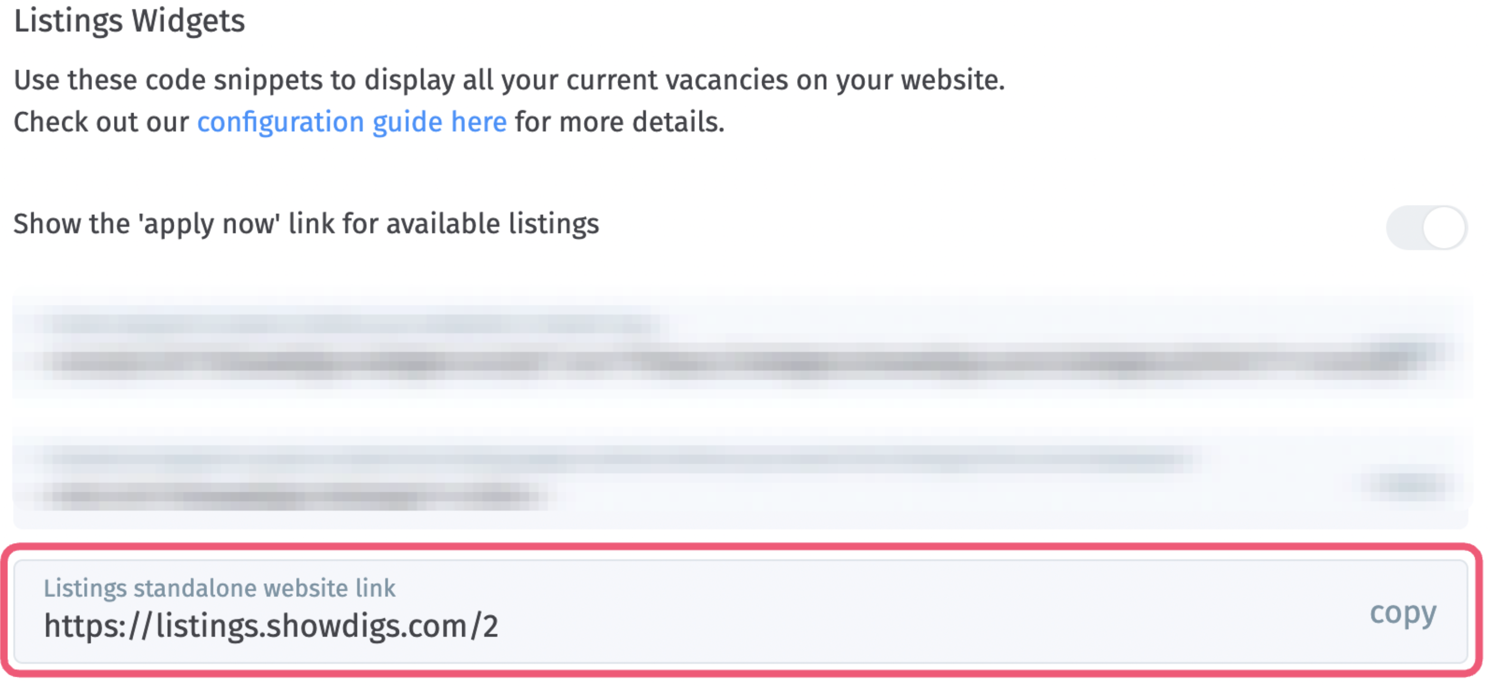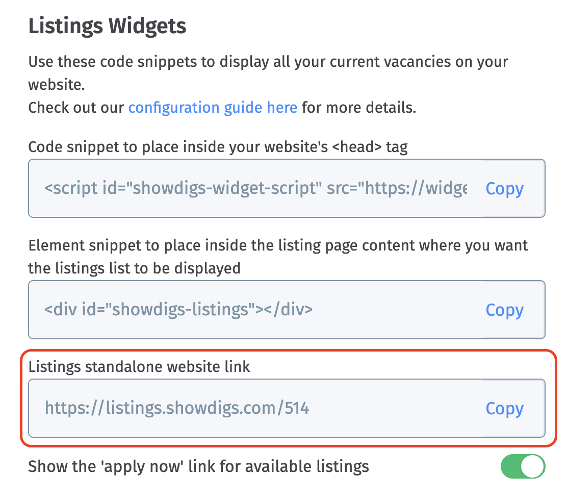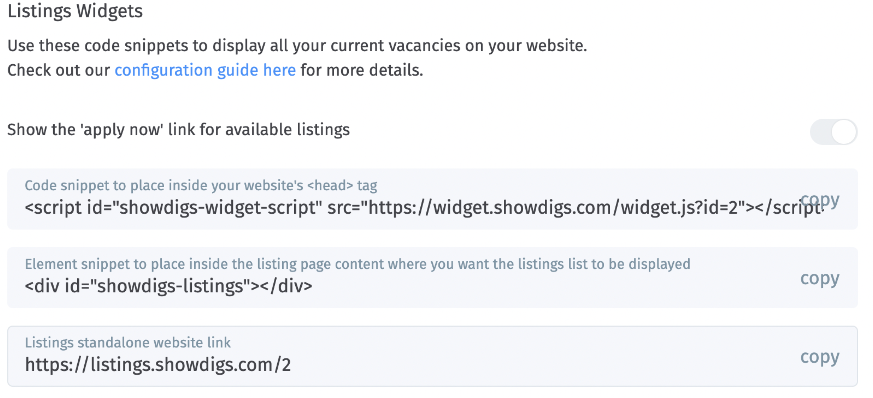 Your listing widget codes are available in your "Settings" screen. Use them to display all your current vacancies on your website.