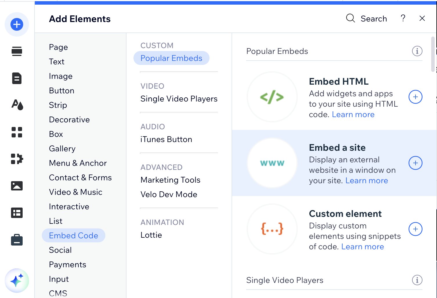 Go to Wix, and open your site in Dev Mode. Go to the page and section you would like to show your listings and click Add Elements > Embed Code > Embed a Site.