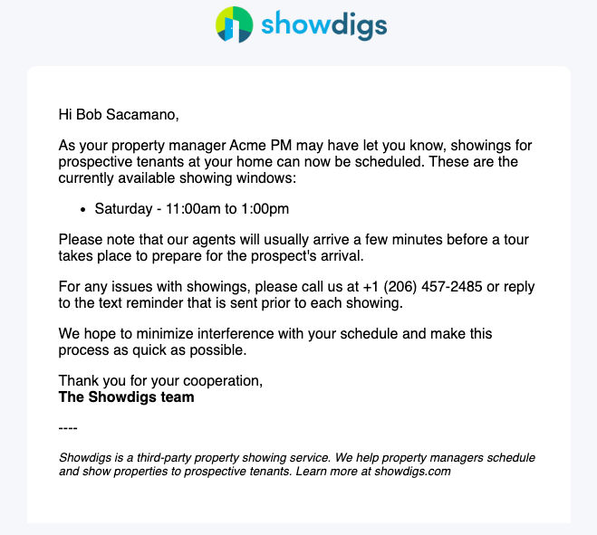 When the property is listed on the market in Showdigs, we will send an email to the tenant informing them that their residence is now available for showings. This email will include the showing windows that you have set up.