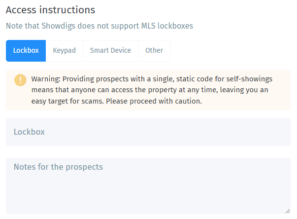 Warning: Using basic lockboxes for self-showings will provide prospects with a single, static code to access your property. This means that anyone can access the property at any time, leaving you an easy target for scams.