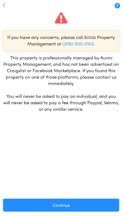 Prospects will first encounter a scam warning that confirms you are the property manager. This warning will include your contact information and a message clarifying that they will not be asked to pay an individual or send fees through services such as PayPal, Venmo, or any similar platforms.