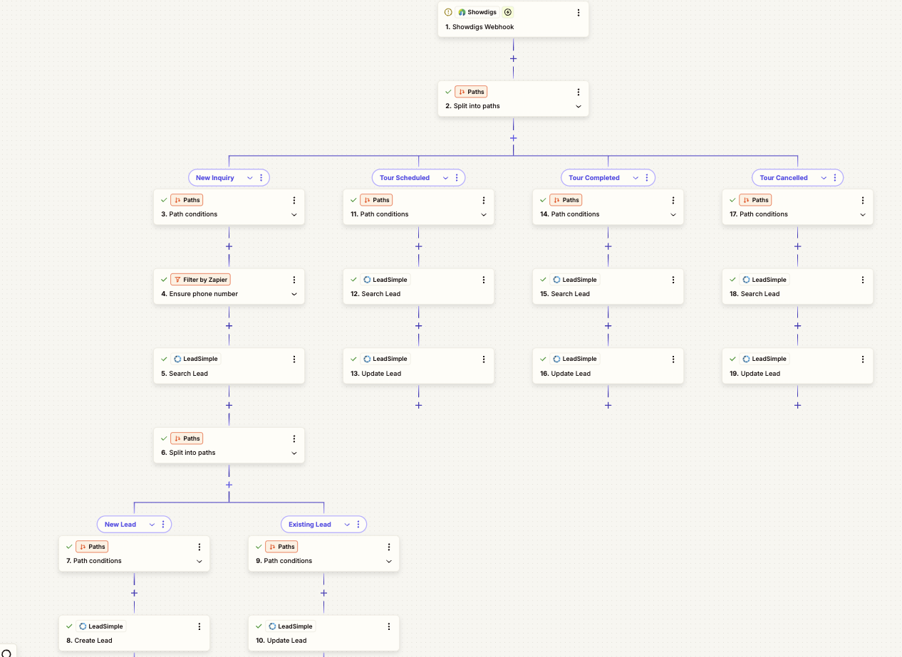 Below is an example of a Zap that was created to sync prospects from Showdigs to LeadSimple. You'll notice a branch for each event type, and then search and create/update actions in LeadSimple.